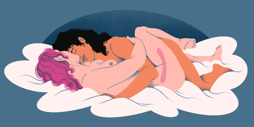 Allongez-vous face à face, les jambes entremêlées. En croisant vos jambes (une au-dessus de la hanche du/de la partenaire, l’autre en dessous), vous pouvez utiliser vos cuisses pour maintenir le jouet en place pendant les mouvements de bassin.
