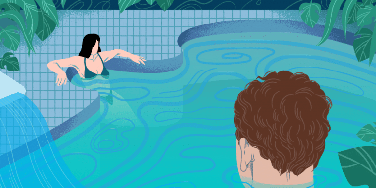 Elle n’hésite pas et plonge dans l’eau peu profonde des bains. Elle prend l’oblique pour l’éviter et nage rapidement sous l’eau en direction de la sortie du bassin. Quand elle ressort la tête de l’eau, elle se retourne immédiatement et apprécie son petit effet : à une bonne distance d’elle, le beau baigneur se trouve à l’endroit exact où elle se tenait trente secondes plus tôt et la cherche partout, l’air surpris.