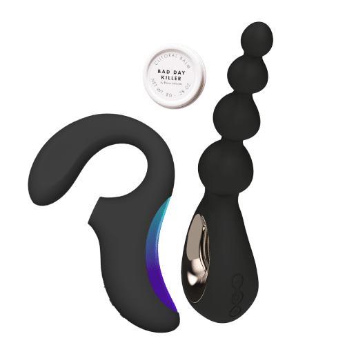 Cosa contiene? Il massaggiatore anale con perline SORAYA Beads, il massaggiatore a tripla stimolazione ENIGMA Wave e il balsamo per clitoterapia Bad Day Killer di Bijoux Indiscrets.